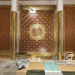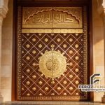 Detail ornamen yang kami kerjakan mengikuti pakem asli pintu Masjid Nabawi, lengkap dengan lingkaran kaligrafi di bagian tengah dan motif bintang-bintang yang presisi.